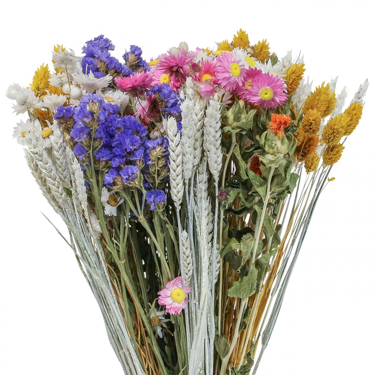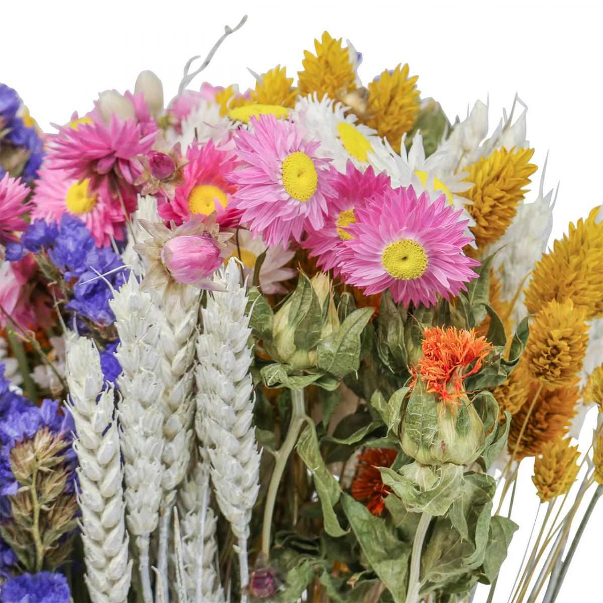 Dostanete veľmi plnú miešanú boho kyticu sušených kvetov z pestrých slamiek, statice, phalaris a pšenice.