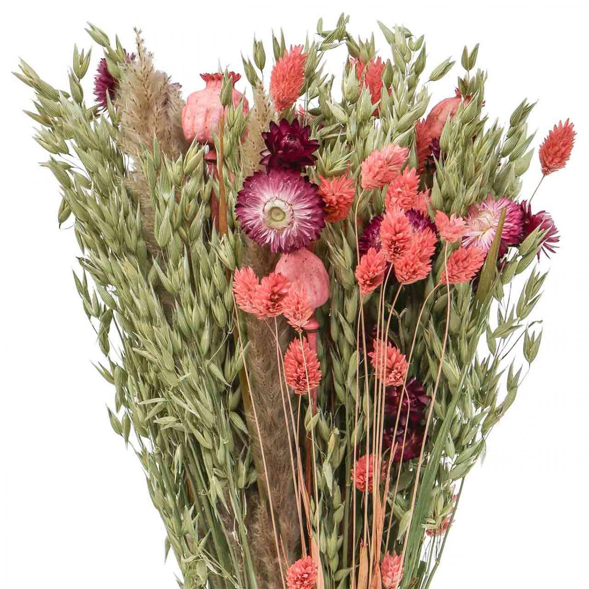 Tu dostanete kyticu sušených kvetov vo veľkých kontrastoch: slamené kvety a farbené tobolky maku, ako aj phalaris v ružovej farbe naozaj dobre ladia s prírodným obilím v podobe stoniek zeleného ovsa a sušenej ostrice.