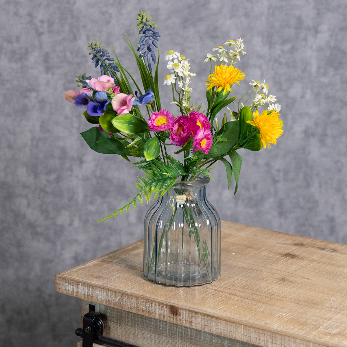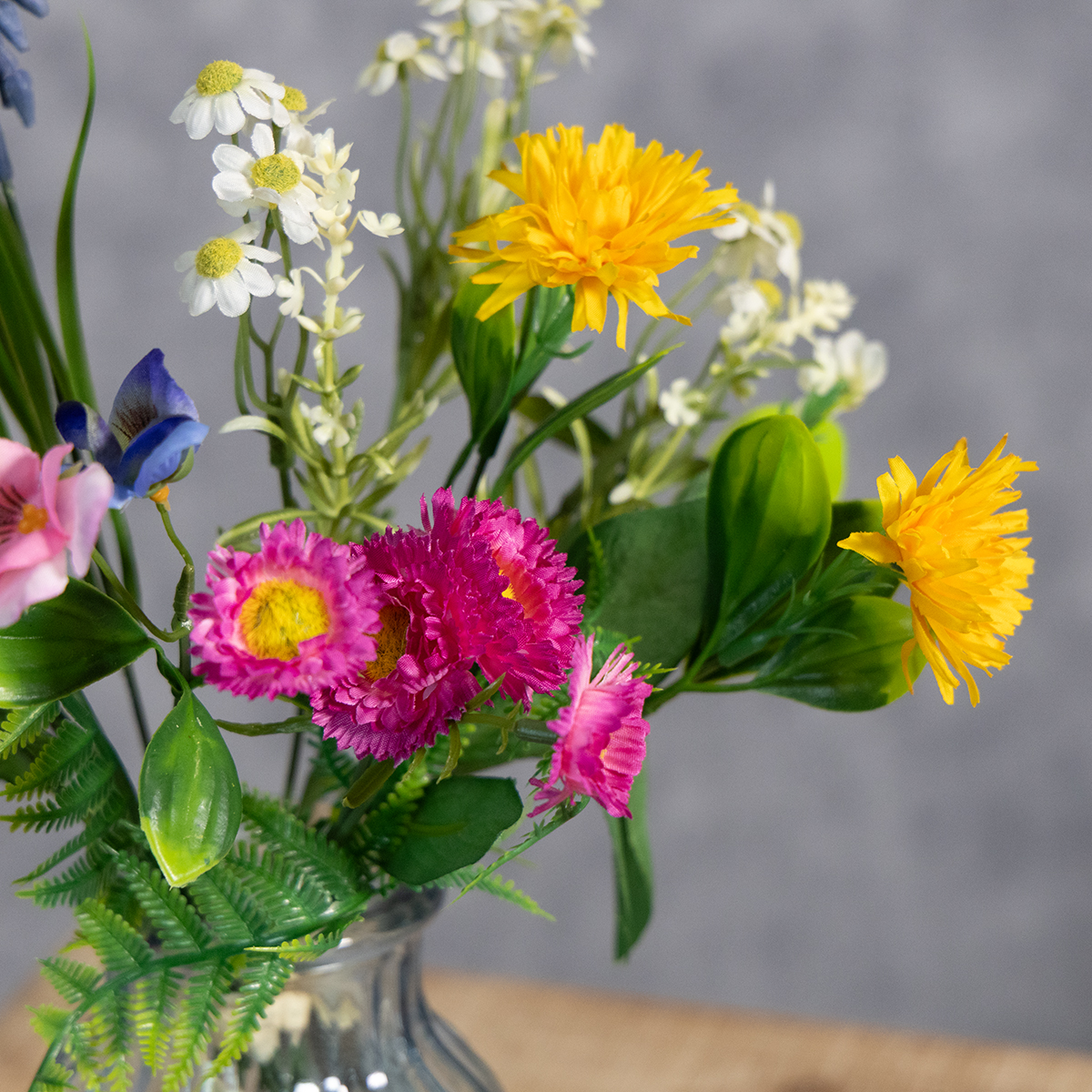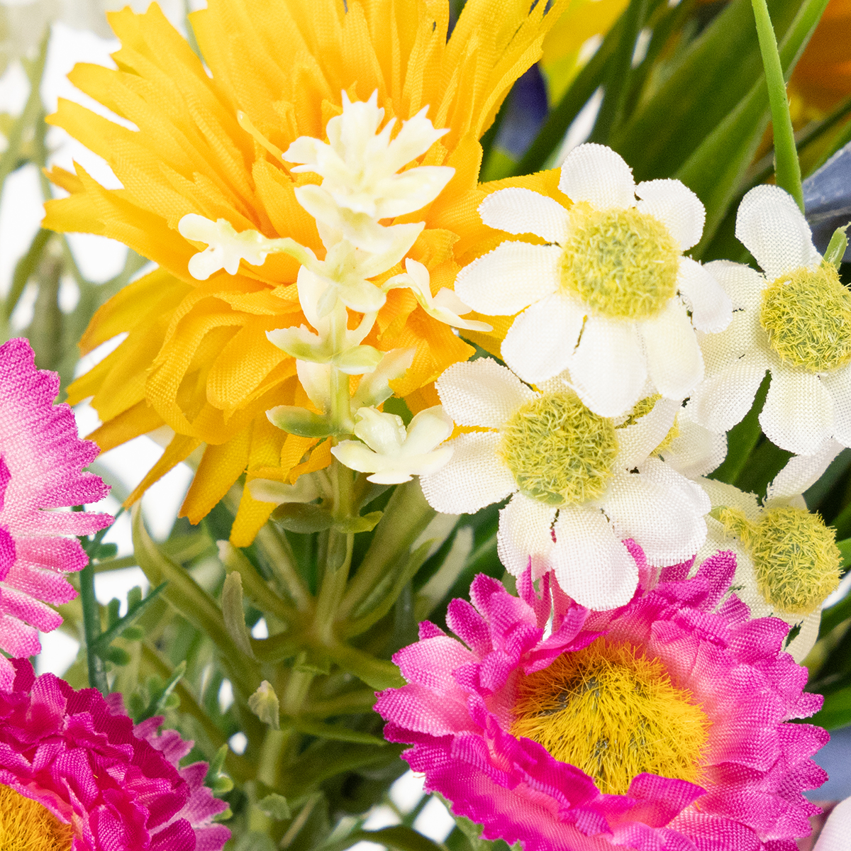 Táto pestrofarebná kytica umelých kvetov s detailne vykreslenými kvetmi v žiarivých odtieňoch žltej, ružovej a modrej prinesie do vášho domova jarný pocit. Vyrobená z vysoko kvalitného polyesteru a plastu, vyzerá neuveriteľne realisticky a zaujme svojou výnimočnou stálosťou farieb a tvaru. Kombinácia farebných jarných kvetov a prírodných zelených tónov ju robí obzvlášť všestrannou: doplní interiér vo vidieckom štýle, vylepší škandinávsky dekor a rovnako dobre ladí s moderným dizajnom.