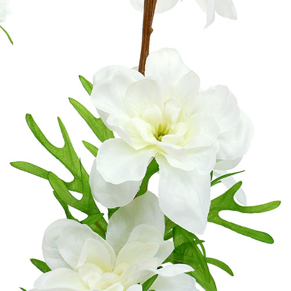 Umelé delphinium v bielej farbe je dlhé asi 95 centimetrov a kvety majú rôzne priemery, ktoré sa pohybujú medzi 4 až 6 centimetrami. Kvitnúca dekoratívna rastlina má pre stabilitu v jadre kovový drôt, ktorý sa dá navyše ľahko ohnúť, aby ste si rastlinku mohli prispôsobiť aj svojej predstave dekorácie.