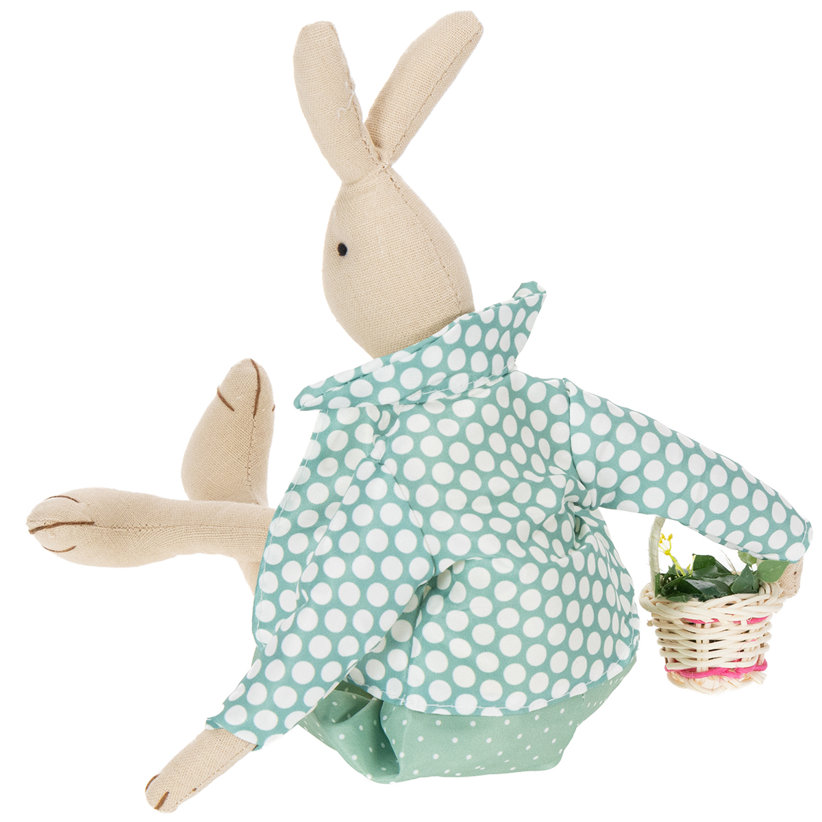 Tento zajačik bol ručne vyrobený s veľkým dôrazom na detail. Zajačik bol ušitý z prírodnej látky a oblečený do žltej košele s bielymi bodkami a drevenými gombíkmi, nohavíc a ladiaceho saka v tyrkysovej farbe, tiež s bodkovým vzorom. Veľkonočný zajačik má na krku jednoduchú papierovú mašľu. Zajačik priniesol malý vysadený kvetinový košík.
