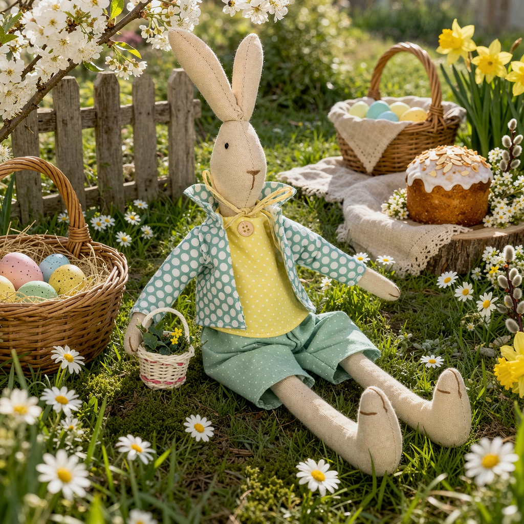 Látkové veľkonočné zajačiky ako tento roztomilý zajačik s oblečením tvoria nádhernú veľkonočnú dekoráciu!