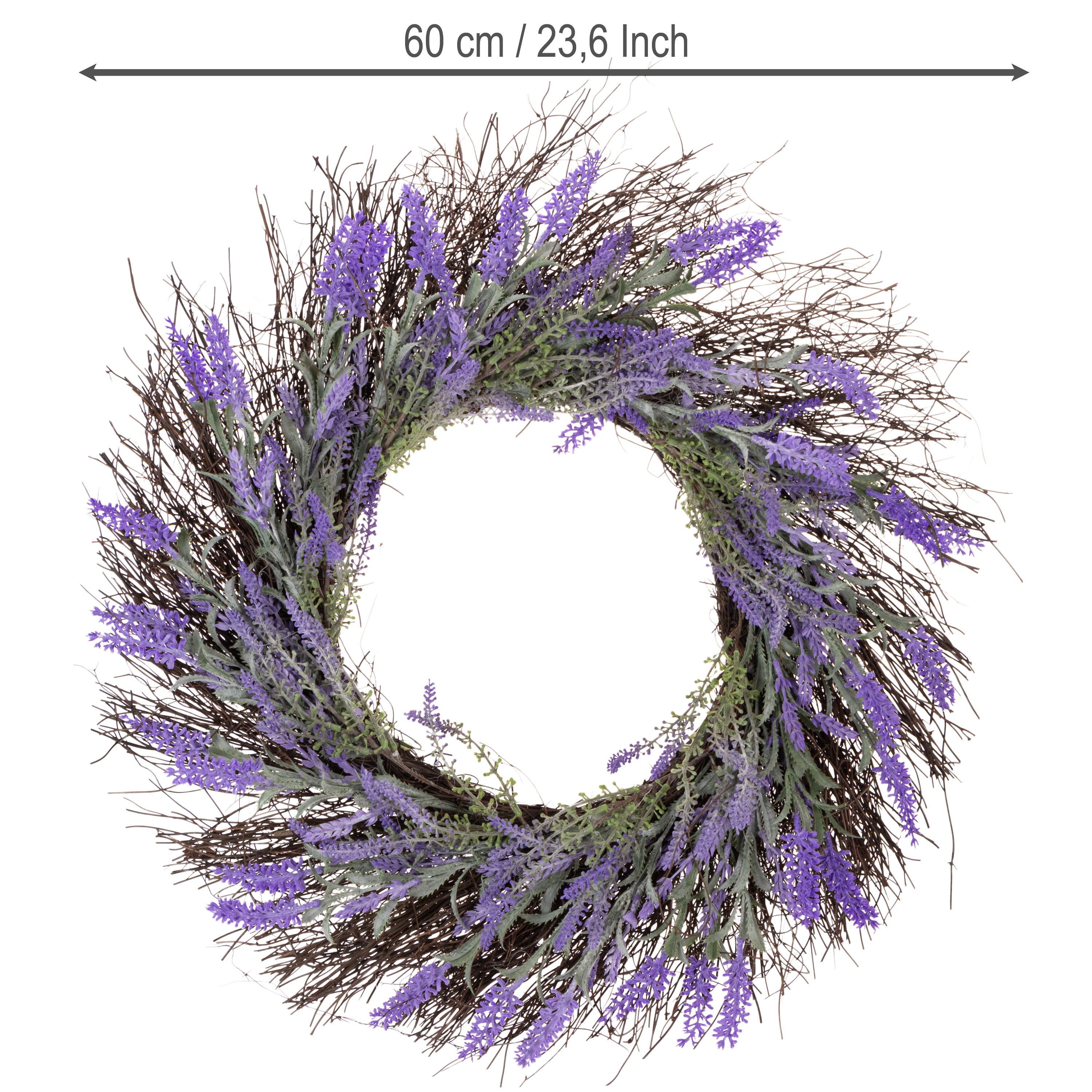 Levanduľový veniec vyžaruje čistú eleganciu. Jeho jemné farby a prirodzene vyzerajúce konáre viniča z neho robia všestranný bytový doplnok. Použite ho napríklad ako dekoráciu na stôl so sviečkami a čerstvými kvetmi alebo ako jarný akcent na terase. Vďaka priemeru 60 centimetrov vynikne všade, kde ho umiestnite, a zároveň zostáva dostatočne neutrálny, aby sa bez problémov začlenil do akéhokoľvek prostredia.