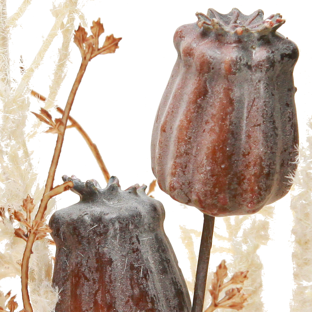 Naša umelá maková kapsulová dekorácia dodá každej kytici elegantný nádych. Umelá papraď a jemné kvety v krémovej farbe dokonale ladia s najrôznejšími interiérmi. Či už klasické, moderné alebo rustikálne – tieto hodvábne kvetinové kytice online sú všestranné a nevyžadujú žiadnu starostlivosť. Okrem toho sú udržateľnou voľbou, pretože majú dlhú životnosť a nevädnú.