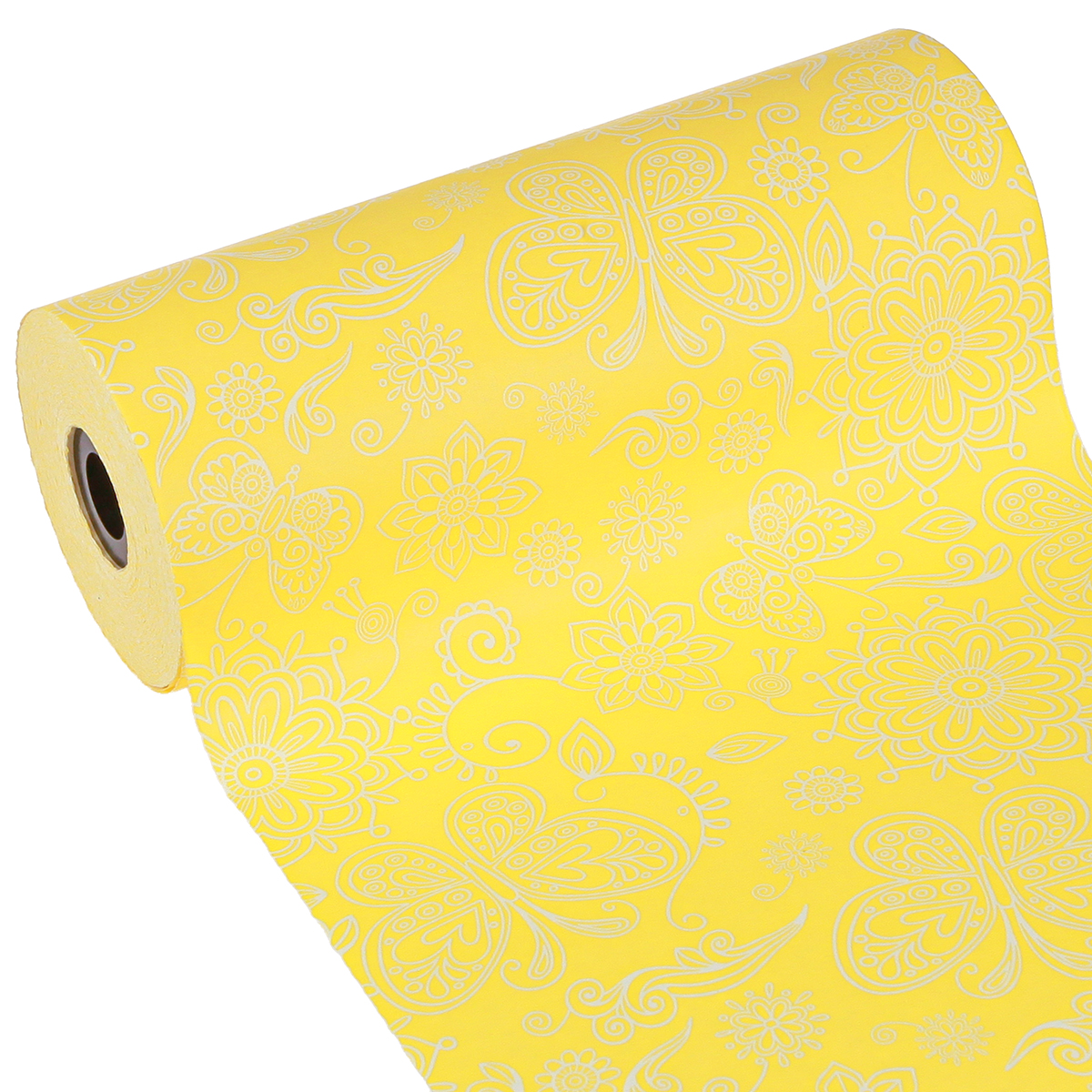 Vzorovaný žltý papier na manžety s bielym vzorom a bielym vnútrom sa dodáva na pevnej cievke, ktorú je možné pripevniť k dávkovaču. To znamená, že papier so šírkou približne 25 centimetrov a dĺžkou približne 100 metrov máte vždy po ruke pre jednoduché balenie!