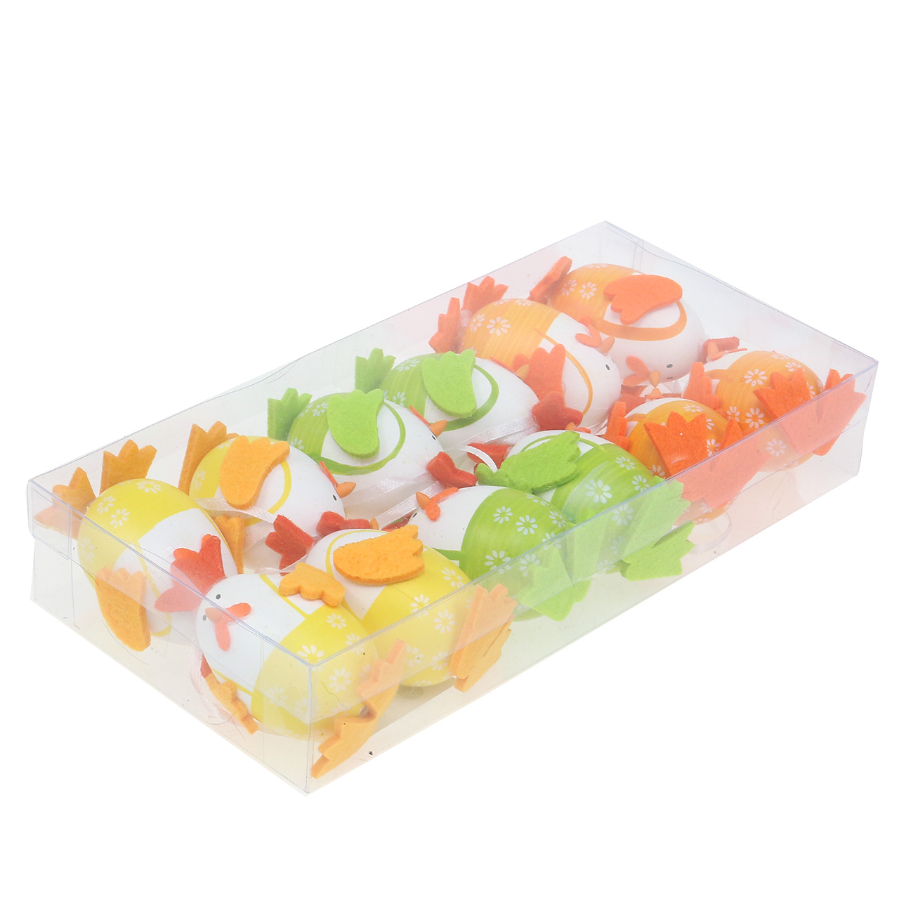 Detailne maľované vajíčko ako kohút na zavesenie v mixe je dodávané v krabičke s celkovým počtom 12 kusov. Každé 4 postavičky majú rovnakú základnú farbu a so stuhou máte celkovú dĺžku cca 13,5 centimetra. Samotné figúrky sú dlhé asi 7,5 centimetra a široké asi 5 centimetrov.