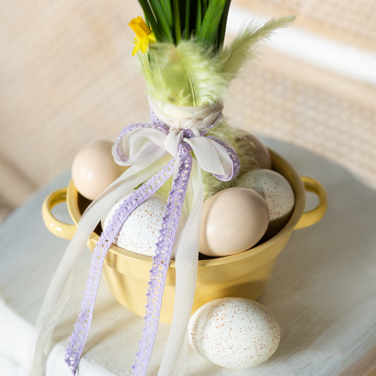 Z ozdobných vajíčok sa dajú vyrobiť napríklad krásne veľkonočné vešiaky. Nemusia byť vôbec náročne namaľované, keďže bodky sú skutočným lákadlom. Kraslice stačí omotať úzkou stuhou alebo ozdobnou plstenou šnúrkou alebo na ne nalepiť sladké nášivky. Teraz už potrebujete len rafiovú šnúru, ktorú horúcim lepidlom pripevníte na vrch vajíčok - veľkonočné ozdoby sú hotové, ktoré môžete úžasne zavesiť na veľkonočnú kyticu z mačičky alebo zlatice. Skvelým nápadom je aj veľkonočný veniec, ktorý môžete použiť ako dekoráciu na dvere. Potrebujete len slamený veniec, pierka a trochu umelého machu – to všetko nájdete v našom sortimente. Veľkonočné vajíčka môžete prilepiť na polotovar horúcim lepidlom. Medzery sa dajú ľahko uzavrieť machom alebo perím. Teraz už potrebujete len pevnú lykovú šnúru, na ktorú zavesíte veľkonočný veniec z prírodnín a už máte veľkonočnú dekoráciu, ktorá poteší celú vašu rodinu.
