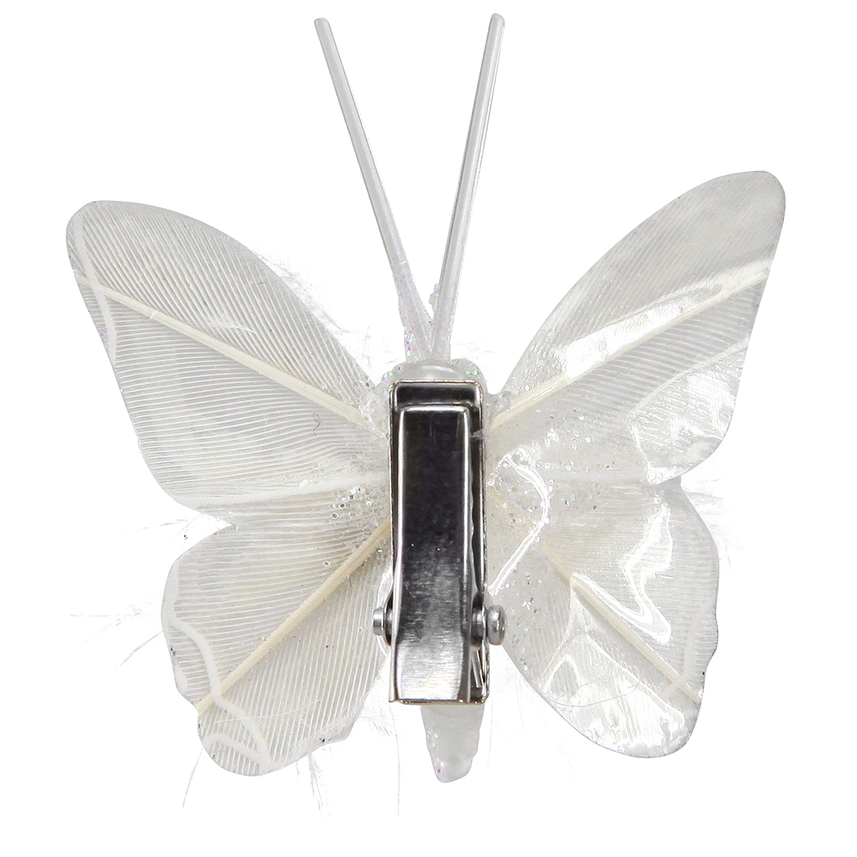 Názov produktu: Motýliky z peria na klipe biele trblietky 5x4,5cm 4 ks