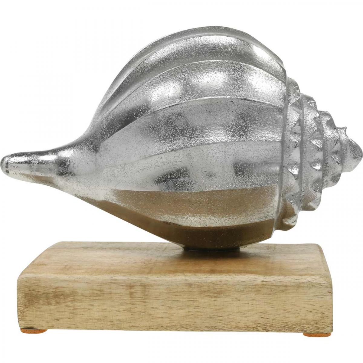 Ušľachtilý kúsok z robustného kovu je pripevnený k jeho podstavcu z prírodného dreva, takže dekorácia mušle je pevná a stabilná. Chrániče na spodnej strane dekoratívnej škrupiny udržujú kovovú dekoráciu protišmykovú a chránia citlivé povrchy pred poškodením.