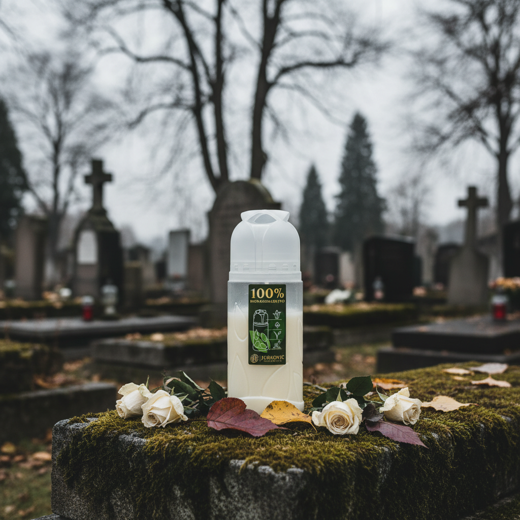 Zvláštnosťou tejto náhrobnej sviečky je jej priehľadný obal zo 100 percentne kompostovateľného plastu, vďaka čomu je sviečka ekologickým spoločníkom na každý hrob. Pečať ICP potvrdzuje, že sviečka je priemyselne kompostovateľná, a preto spĺňa vašu túžbu po trvalo udržateľnom živote aj ako suvenír.