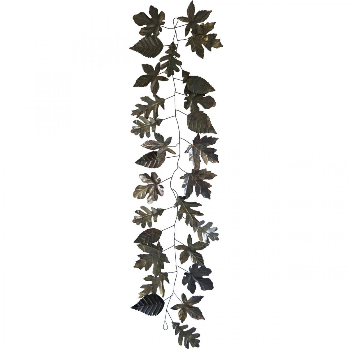 Kovová nástenná dekorácia zobrazuje girlandu z listov. Kovová girlanda, navrhnutá v krásnom starom mosadznom vzhľade, je skvelým nápadom na jesennú dekoráciu.Na girlande vidno typické dubové listy, chýbať by nemali ani javorové listy. Okrem toho možno objaviť široké krátke listy, ako má lipa. Listy jesennej girlandy sú umiestnené na stonkách pripevnených vľavo a vpravo od hlavnej osi.