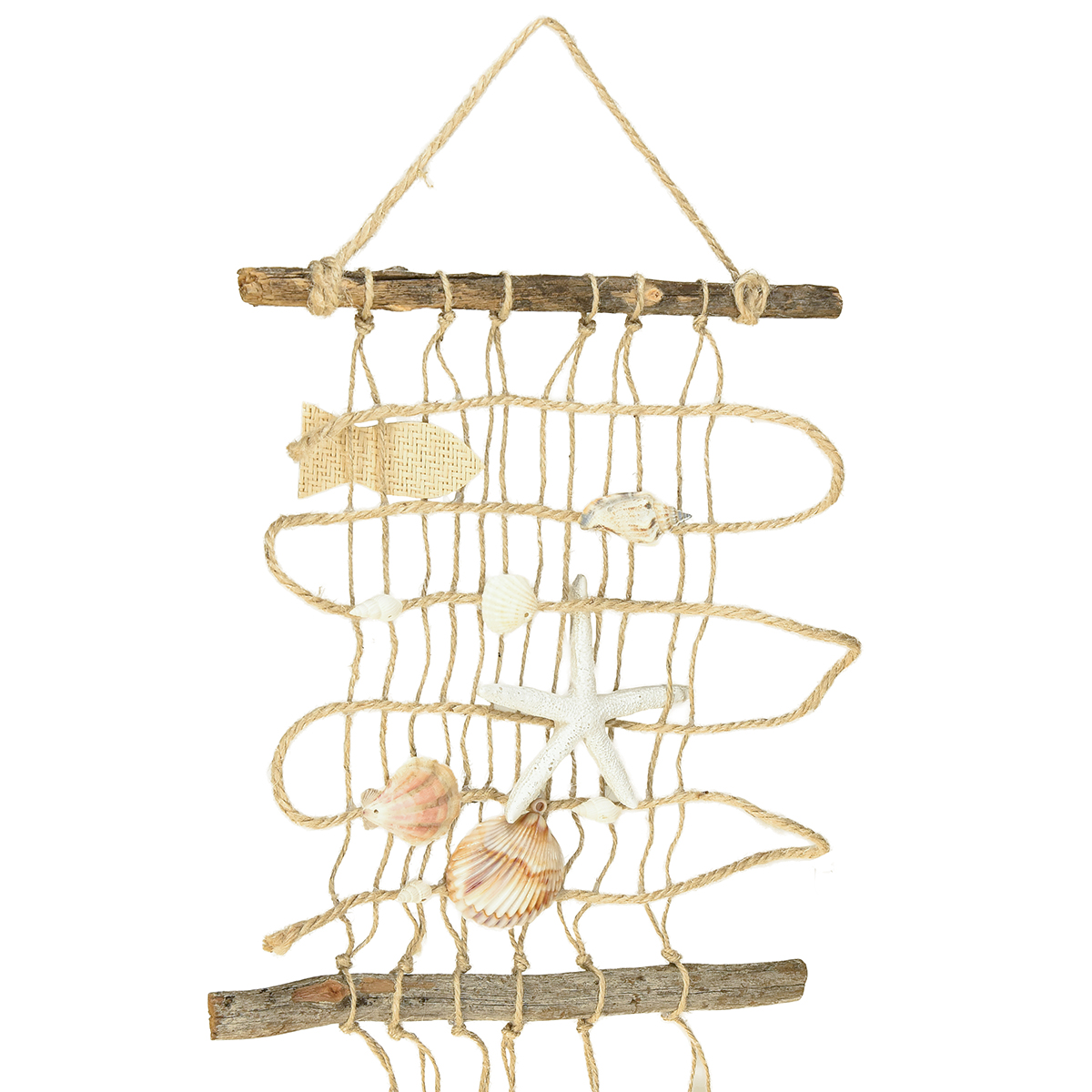 Jutová sieť je zavesená medzi dvoma drevenými tyčami a dlhé strapce v spodnej časti vytvárajú voľný vzhľad tejto závesnej dekorácie pripomínajúcej makramé. Umelé mušle, ulity slimákov a umelá hviezdica premenia dekoratívnu sieť na kompletnú námornícku dekoráciu!