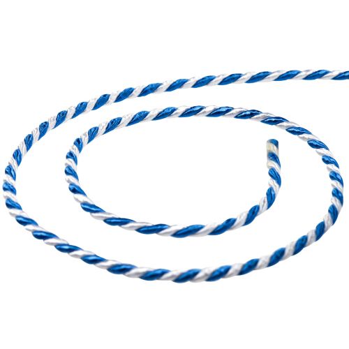 Modré a biele pramene sú veľmi úhľadne a pravidelne spletené do pevnej šnúry. Hrubá a robustná ozdobná šnúra vyzerá krásne na vencoch a aranžmánoch, ale dá sa tiež krásne omotať okolo pohárov a váz alebo použiť na remeslá a upcykláciu.