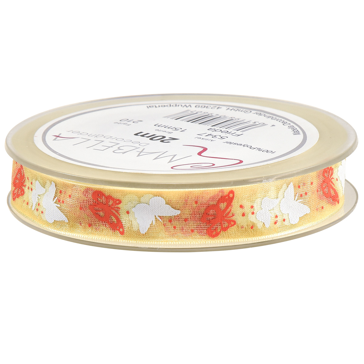 Exkluzívna organzová stuha v žltej farbe s motýlikmi má šírku okolo 15 milimetrov a dĺžku okolo 20 metrov. Celá páska je navinutá na plastovej rolke, ktorú môžete jednoducho zavesiť aj na dávkovač.