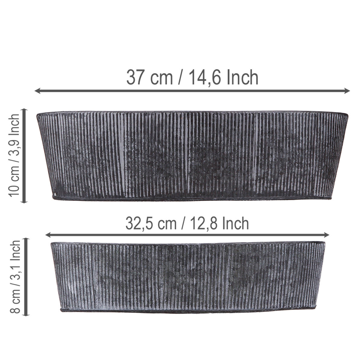 Oválna misa vyrobená z kovu a čiernej farby spája štýlovú eleganciu s očarujúcou vintage estetikou, ktorá vylepší váš domov. Či už ako pútavá dekoratívna miska, ako nostalgická dekorácia na stôl alebo ako rustikálna kvetinová miska – táto sada dvoch stohovateľných kovových misiek otvára množstvo kreatívnych možností. Elegantná farebná schéma v čiernej, pranej šedej, ako aj dizajn s jemnými drážkami dokonale ladia s akýmkoľvek interiérom v shabby chic alebo industriálnom štýle. Misky použite ako misky na rastliny a pridajte zelený melír s izbovými rastlinami alebo bylinkami. Menší z nich je ideálny pre štýlové uloženie kľúčov alebo pre sukulenty.