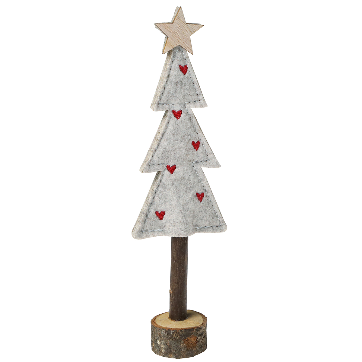 Mini vianočné stromčeky s výškou okolo 21 cm sú dostupné v dvoch verziách: s červenými hviezdičkami a s červenými srdiečkami. Kmeň a základ stromu sú vyrobené zo skutočného dreva s kôrou, čo dáva každému kusu individuálny a prirodzený nádych. Kombinácia mäkkej plsti a hrejivých drevených prvkov vytvára útulnú atmosféru a skvele sa hodí k vidieckemu štýlu alebo modernému interiéru Scandi.