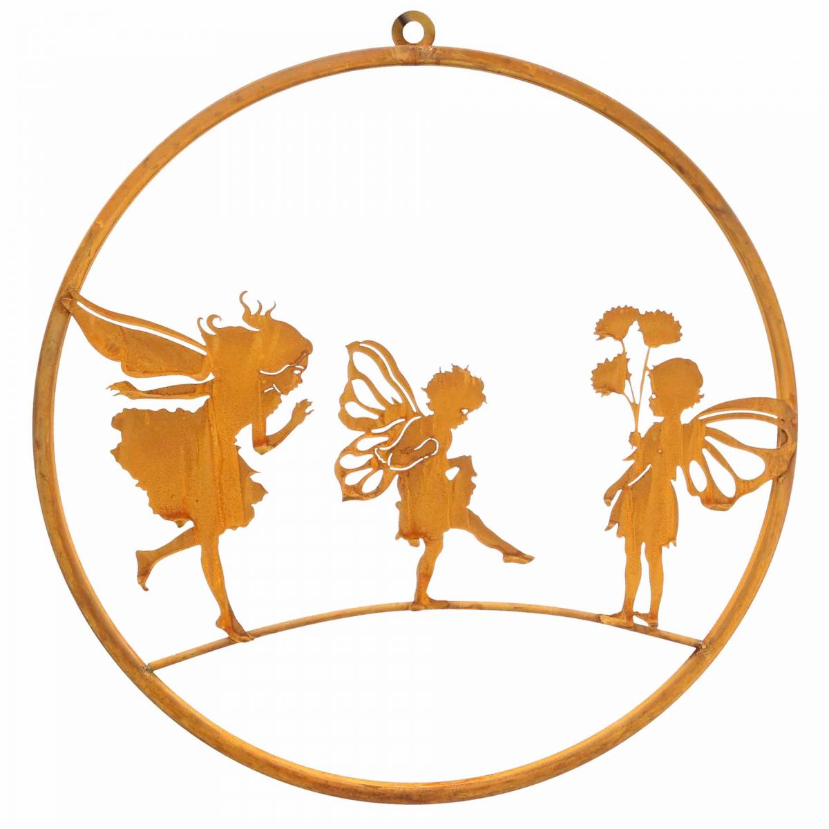 Tento ozdobný prsteň vyrobený z kovu zobrazuje tri hrajúce sa deti škriatok. Dekorácia hrdza s patinou je krásnou dekoráciou na jar.Vzpera v spodnej tretine kovovej ozdoby symbolizuje cestu alebo cestičku. Hrajú sa na ňom tri deti s krídlami motýľa alebo vážky. Dieťa s veľkými kvetmi trpezlivo pozerá na ostatných dvoch škriatkov, ktorí akoby tancovali. Ak prostredné dieťa poskakuje na jednej malej nohe, väčšie s dlhými vlasmi sa zohne, aby tancovalo.