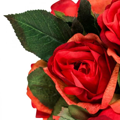 Tieto ozdobné ruže sú zviazané do nádhernej kytice. Umelé kvety predstavujú červené ruže a pôsobia mimoriadne živo.Niektoré ruže majú dokonca listy, ktoré majú na vonkajšom okraji žlto-oranžový farebný gradient. Zelené lupienky ruží majú tmavý vrch a svetlú spodnú stranu. Zubaté okraje a viditeľná žilnatina listov umocňujú na prvý pohľad dojem, že ide o prírodné rastliny.