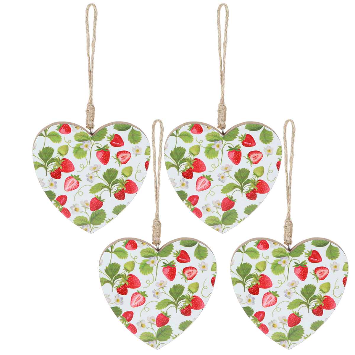Ozdobné srdce s motívom jahôd – letný drevený prívesok na vidiecky domček 10cmx10cm 4 ks