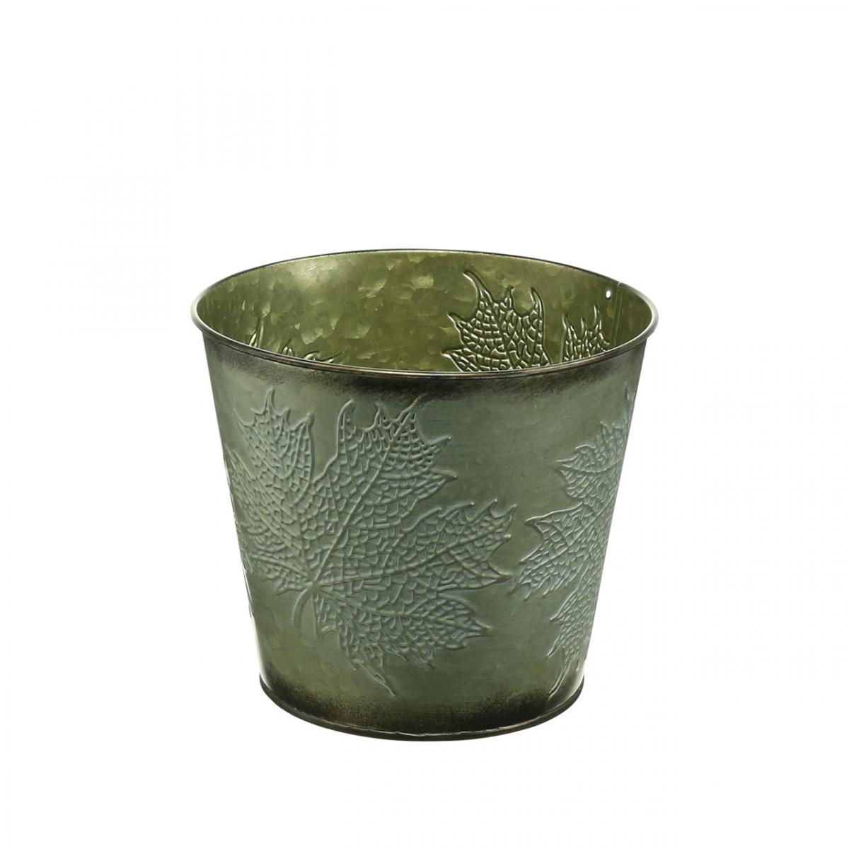 Ozdobné vedierko s ozdobou lístia, jesenný črepník, kovová dekorácia zelená Ø17cm V14,5cm