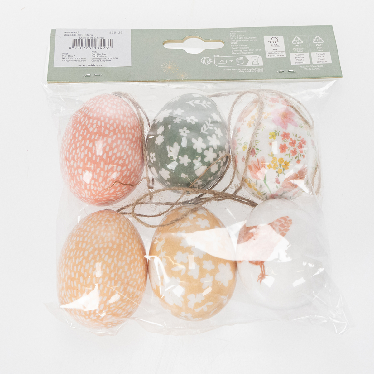 Tieto veľkonočné vajíčka s výškou 6 cm a priemerom 4 cm majú krásne proporcie a vytvárajú decentný, no zároveň výrazný dojem. Sú vyrobené z pevného plastu s veselým, žiarivým dizajnom, takže sú obzvlášť odolné – ideálne na opakované použitie v nasledujúcich rokoch. Umelecké vzory v jemných pastelových odtieňoch dopĺňajú moderný vzhľad alebo útulný vidiecky štýl. Krásne ladia v kombinácii s inými dekoratívnymi predmetmi, ako sú malé keramické zajačiky alebo jemný mach.