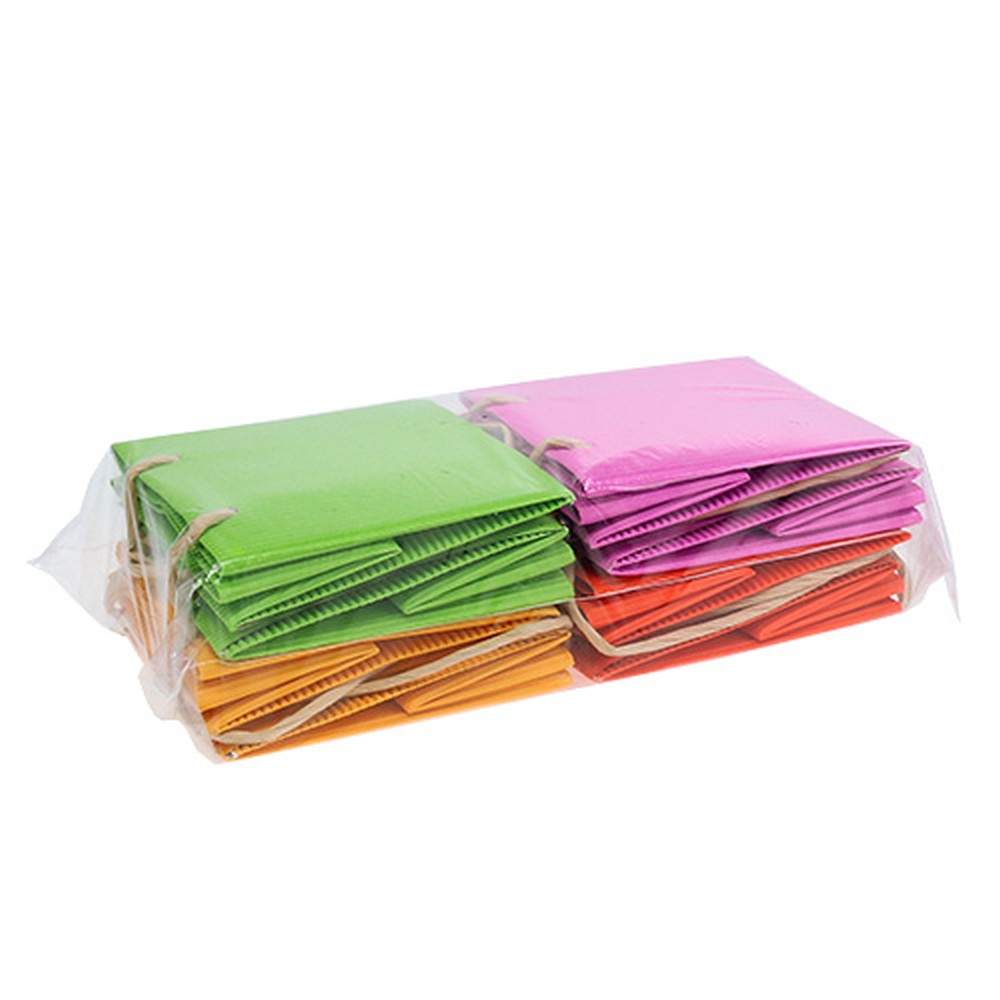 Papierová taška je súčasťou sady 8 kusov, každá s 2 vrecúškami vo farbe oranžovej, zelenej, žltej alebo ružovej. Rozmery každej tašky sú približne 10,5 x 10,5 x 10,5 centimetra. Darčeková taška je stabilná aj vďaka tomu, že jej povrch je rebrovaný a znesie tak väčšiu váhu. Dno je navyše vystužené dodatočným kartónom. Veľmi šik pôsobí kabelka aj vtedy, ak ju naplníte domácimi koláčikmi alebo inými pochúťkami a potom si ich veľmi štýlovo vezmete so sebou na stretnutie s priateľmi.