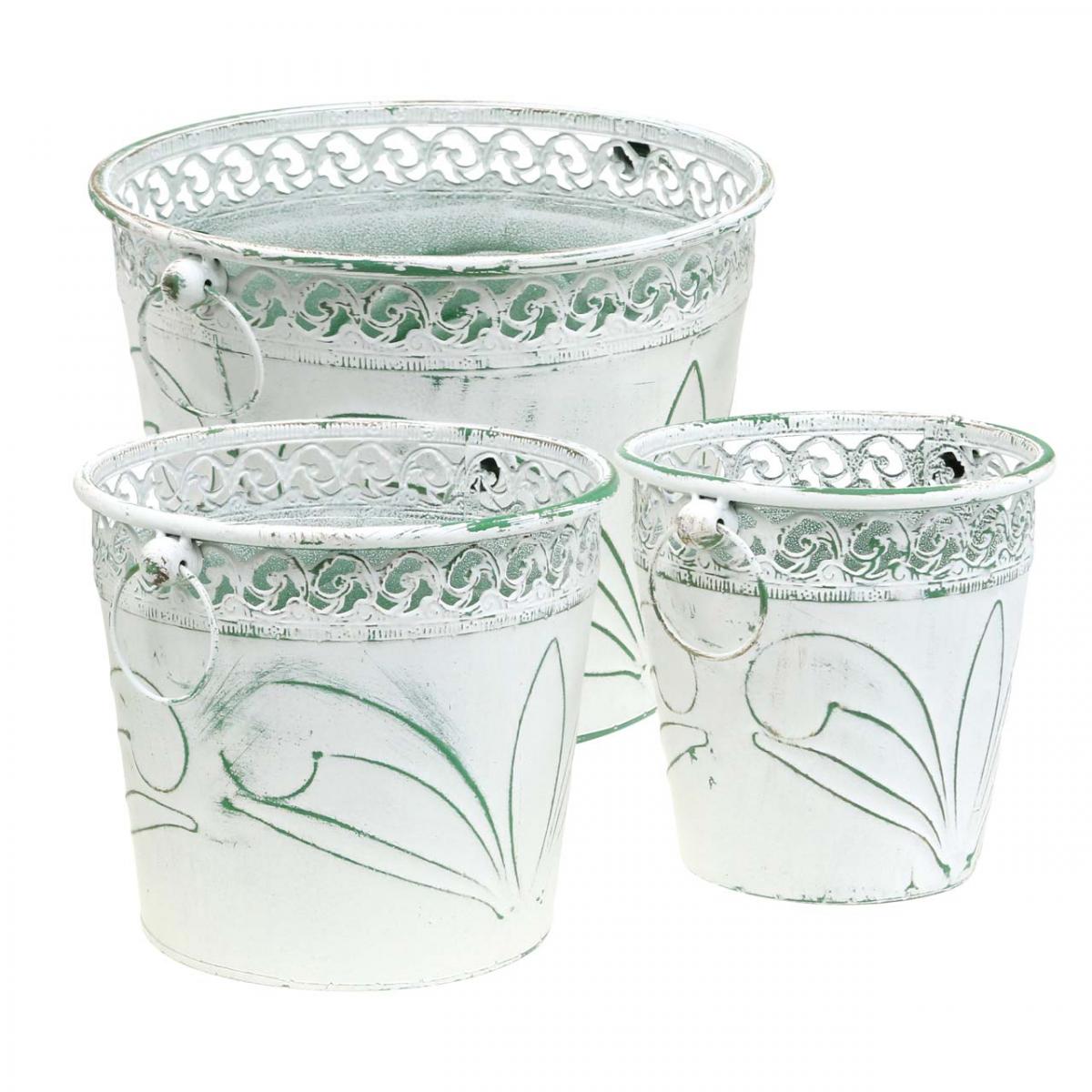 Plechové vedierko s razením, kvetináč s rúčkami biela, zelená shabby chic V22/19,5/17,5 cm Ø25,5/20,5/15,5 cm sada 3ks