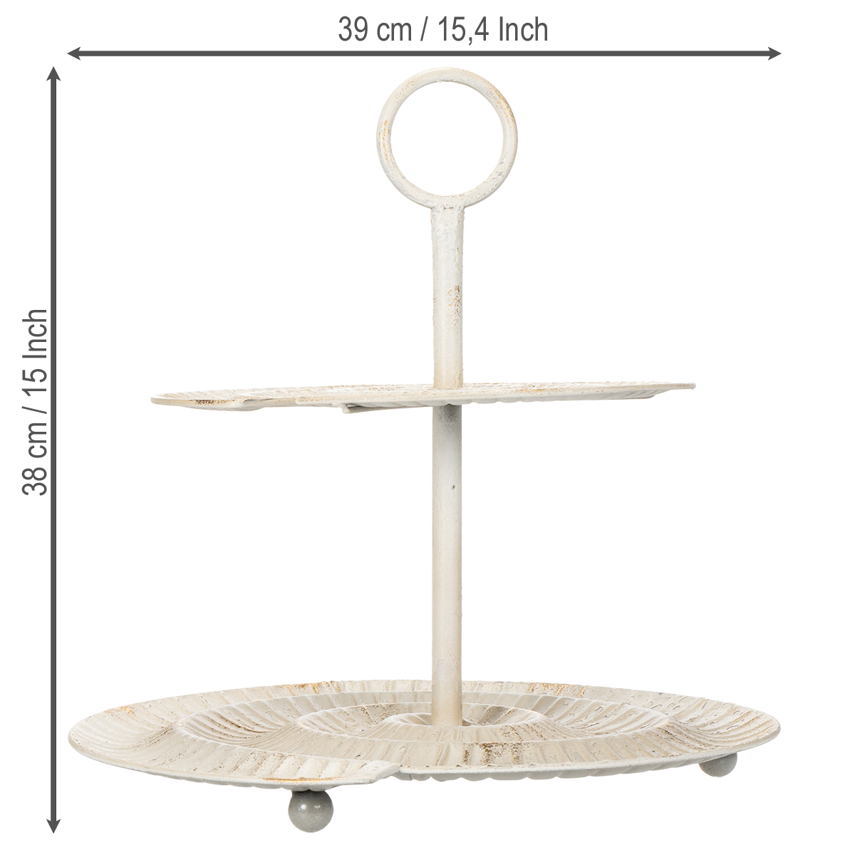 Či už ide o uvoľnené posedenie pri káve, slávnostnú rodinnú oslavu alebo jednoducho o každodenné použitie – správna prezentácia dezertov, pečiva alebo malých pochúťok má veľký význam. S týmto kovovým stojanom na dezerty v očarujúcom vintage štýle prinesiete na váš stôl nielen poriadok, ale aj eleganciu. Tento dvojposchodový stojan zaujme svojím detailným dizajnom a bielou farbou, ktorá sa krásne hodí do štýlu shabby chic. Skutočný vrchol do obývačky alebo kuchyne!