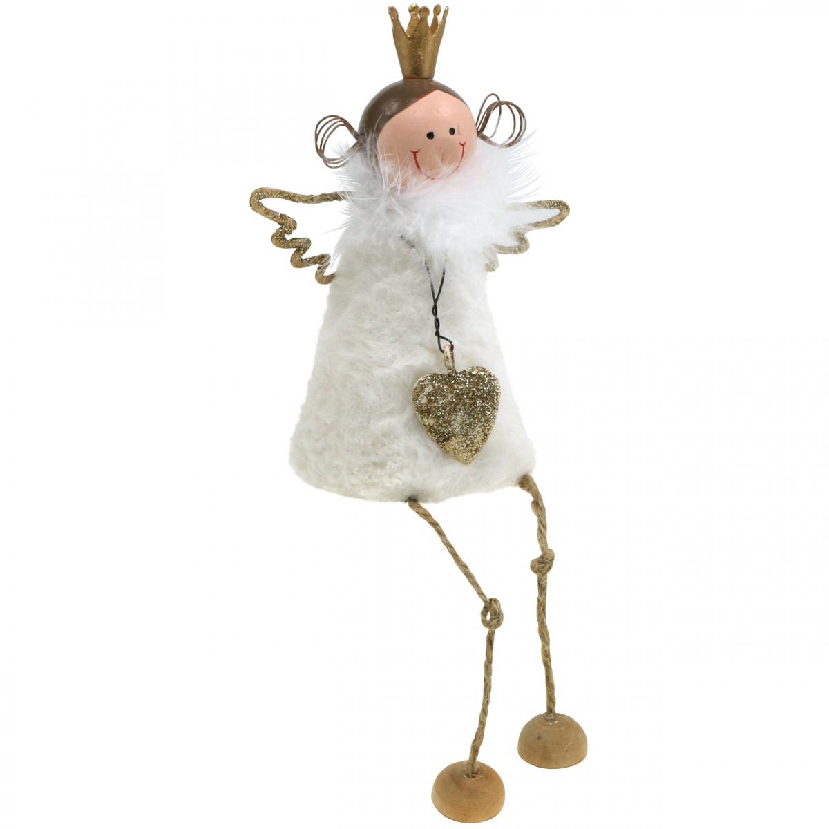 Nadýchané šaty s bielym perovým golierom sú obtočené okolo kovového tela ozdobného anjelika v tvare zvončeka. Na drôtiku uviazanom ako retiazka cez šaty visí trblietavé srdiečko zlatej farby. Drevená tvár so svetlou pleťou ukazuje široké usmievavé ústa a malé čierne oči. Z namaľovaných vlasov po stranách vykúkajú dva okrúhle bočné vrkoče z drôtu. Drôt je tiež zafarbený rovnakou hnedou farbou, aby zodpovedal farbe vlasov. Postava anjela má na hlave zlatú korunu. Krídla sú tiež zlatej farby a zdobené trblietkami. Roztomilá drevená a kovová vianočná dekorácia na parapety a okraje komôr!