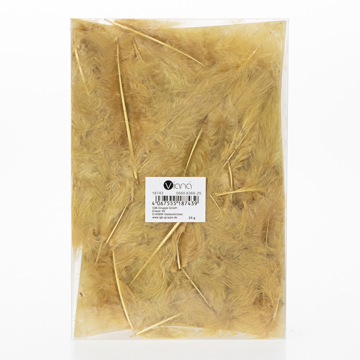 - Pravé, nadýchané vtáčie pierka v svetložltej farbe