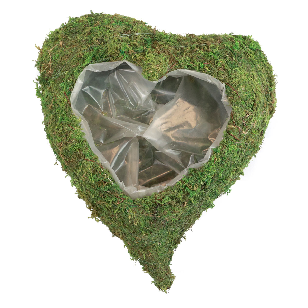 Rastlinné srdce je stabilizované kovovým rámom, ktorý má siluetu srdca. Zelené vlákna držia mach pohromade ako jemná sieť. Do žľabu výsadbovej misky je už vtiahnutá fólia a upevnená čiernymi sponami, do ktorých môžete umiestniť kvetináče alebo vyplniť zeminu.