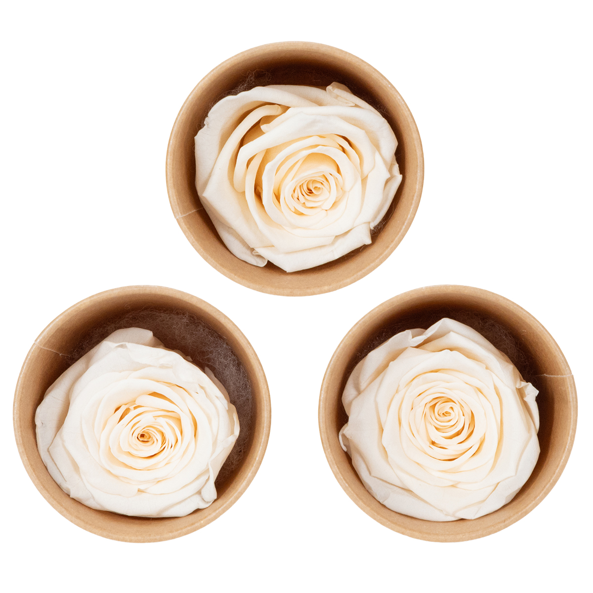 Či už ide o svadobné dekorácie, elegantné kvetinové aranžmány alebo sofistikovaný detail v interiérovom dizajne – týchto šesť konzervovaných kvetov jednoducho upúta pozornosť. Ich decentná krémová farba ladí s takmer akýmkoľvek štýlom, od minimalistického cez vintage až po romantický. Buďte kreatívni a dodaj svojim obľúbeným projektom ten špeciálny nádych bez toho, aby ste sa museli obávať o ich dlhú životnosť. Večné ruže pre vaše dekorácie – čo môže byť štýlovejšie?