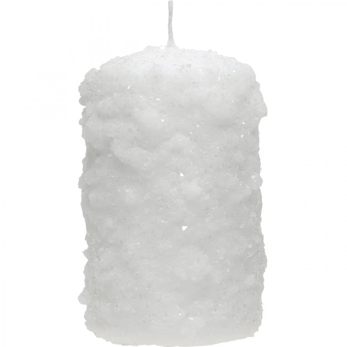 Vianočné sviečky majú povrchovú štruktúru utlačeného snehu a tiež mrazivo trblietavé z malých priehľadných čiastočiek, ktoré boli nepravidelne nanesené na stĺpové sviečky na advent.