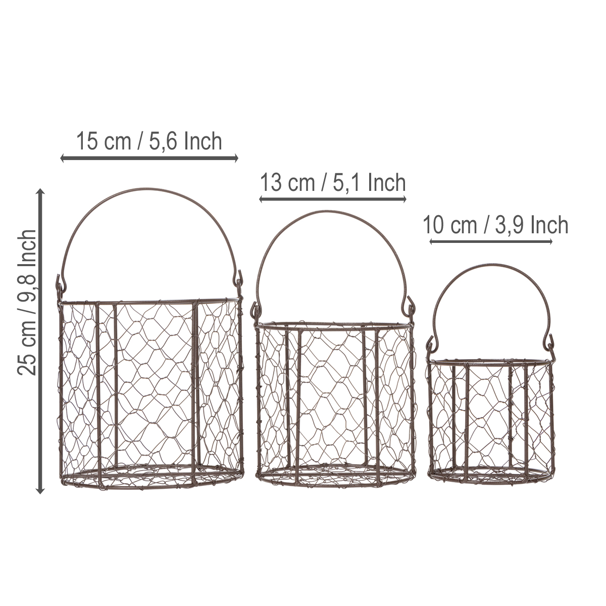 Táto sada troch drôtených košov je víťazom vo všetkých ohľadoch. Sú vyrobené z pevného kovu a vďaka jemnej sieťovine mimoriadne odolné, takže sú perfektným doplnkom každej modernej domácnosti. S priemerom 15 cm (veľký košík) a výškou 25 cm sa do nich zmestí prakticky všetko, čo chcete mať poriadne usporiadané. Ovocie a zelenina? Žiadny problém. Kuchynské náčinie alebo látkové obrúsky? Perfektné. Alebo možno uprednostňujete dekoratívny nádych? Rastlinné aranžmány a kvety v týchto košíkoch rozvinú svoje špeciálne čaro. Vďaka okrúhlemu tvaru a pevnej rukoväti sa dajú košíky ľahko prenášať z miestnosti do miestnosti alebo do záhrady. Každý, kto miluje vintage štýl, bude okamžite uchvátený. Hnedá farba zabezpečuje, že sada harmonicky zapadne do akéhokoľvek interiéru – od škandinávskeho minimalizmu až po rustikálny vidiecky štýl. Košíky vyzerajú obzvlášť dobre v kombinácii s inými dekoratívnymi prvkami z prírodných materiálov. Prečo ich nevyskúšať?