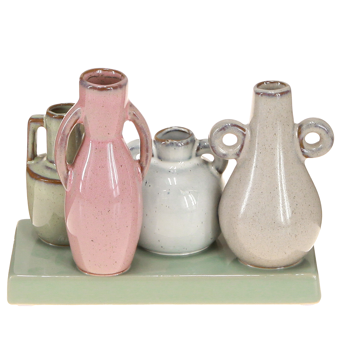 Táto sada mini keramických váz sa skladá zo štyroch malých vázičiek usporiadaných na jednoduchom zelenom podnose. Každá váza má jedinečný tvar – od cibuľovitého až po štíhly, s ozdobnými úchytkami alebo jednoduchými krivkami. Táto rozmanitosť zabezpečuje, že sada vytvára harmonický vzhľad a zároveň si zachováva svoj individuálny charakter. Ružová, zelená a biela farebná schéma evokuje jarnú sviežosť bez toho, aby bola príliš výrazná. Nepochybným plusom je, že vysoko kvalitná keramika s hladkým, lesklým povrchom dodáva sade elegantný nádych. Či už sú naplnené čerstvými jarnými kvetmi, sušenými vetvičkami alebo dokonca bez kvetov, tieto malé vázy vždy upútajú pozornosť. Perfektne sa hodia do moderného minimalistického alebo škandinávskeho interiérového dizajnu. A pre tých, ktorí uprednostňujú útulnejší pocit, sadu možno použiť aj vo vidieckom štýle, napríklad v kombinácii s drevenými alebo pletenými prvkami. Jednoducho úžasná v kombinácii so svetlými prestieraniami alebo zlatými svietnikmi. Vďaka svojim kompaktným rozmerom (dĺžka 14 cm, šírka 7 cm a výška 11 cm) sa táto sada zmestí prakticky kamkoľvek: na úzke príborníky, ako dekorácia stola v jedálni alebo ako štýlový doplnok na police. Robustná konštrukcia tiež zaisťuje dlhotrvajúci pôžitok. Každý, kto hľadá decentnú, no zároveň štýlovú dekoráciu, bude nadšený.