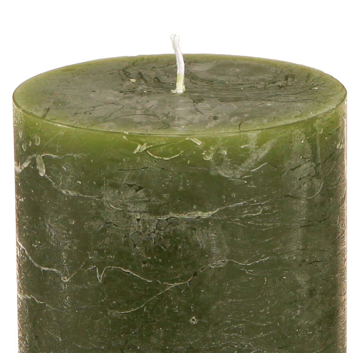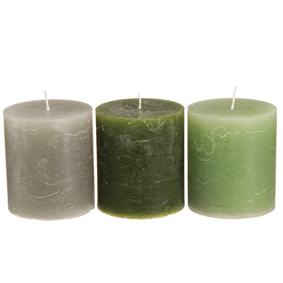 Sada stĺpových sviečok, 3 odtiene zelenej, celoplošne farbené, dekoratívne sviečky na dekoráciu stola a wellness, 70x80 mm, 12 kusov