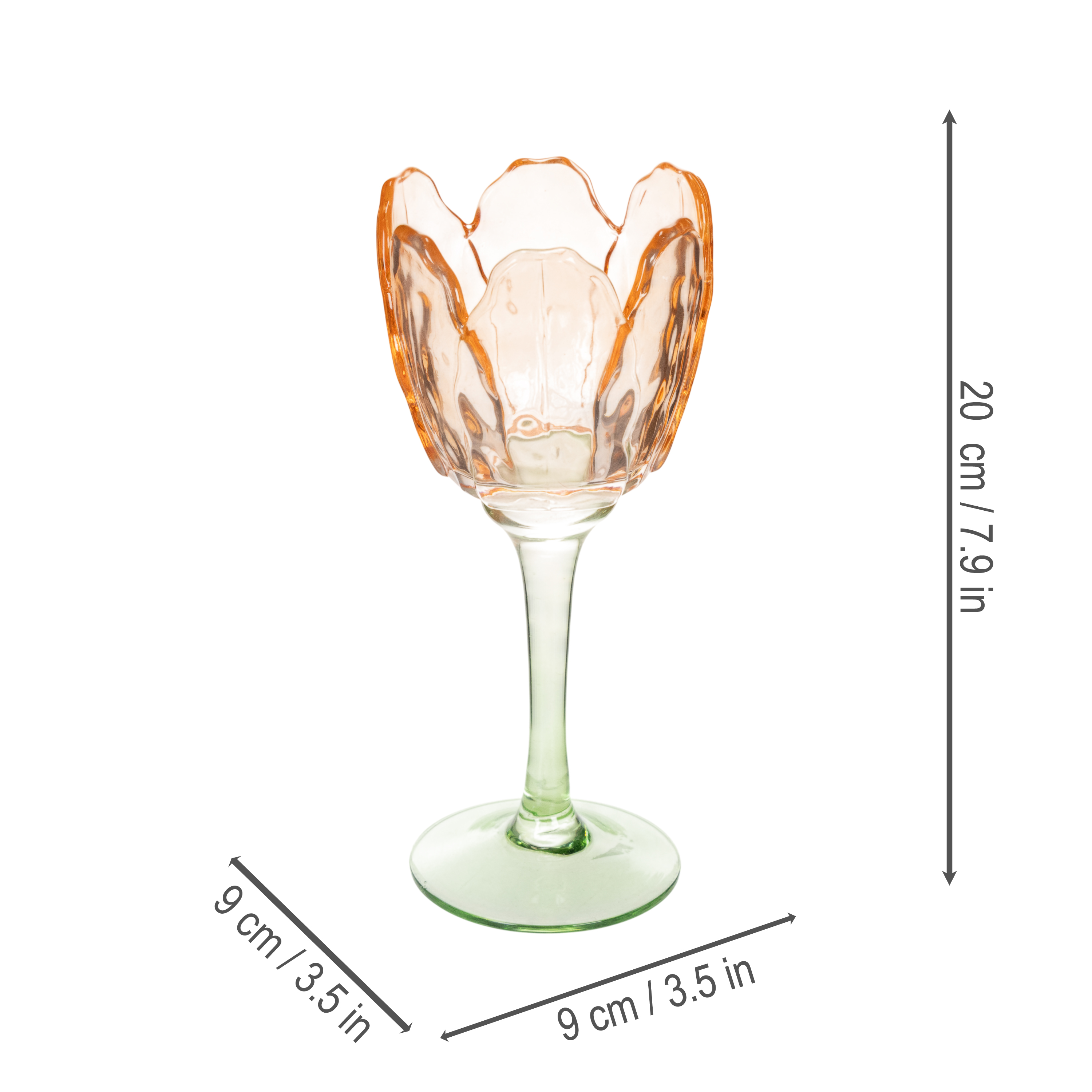Tento sklenený svietnik na čajové svietniky zaujme svojím krásnym tvarom a všestrannosťou. Otvor v tvare kvetu pripomína jemne kvitnúci tulipán, dokonale navrhnutý na udržanie teplého a príjemného svetla sviečky. S dĺžkou, šírkou a priemerom 9 centimetrov a výškou 20 centimetrov sa bez problémov hodí do akéhokoľvek prostredia bez toho, aby bol rušivý. Jemné oranžové odtiene skla krásne ladia s rôznymi štýlmi interiérového dizajnu – od vidieckeho a shabby chic až po moderný a romantický.