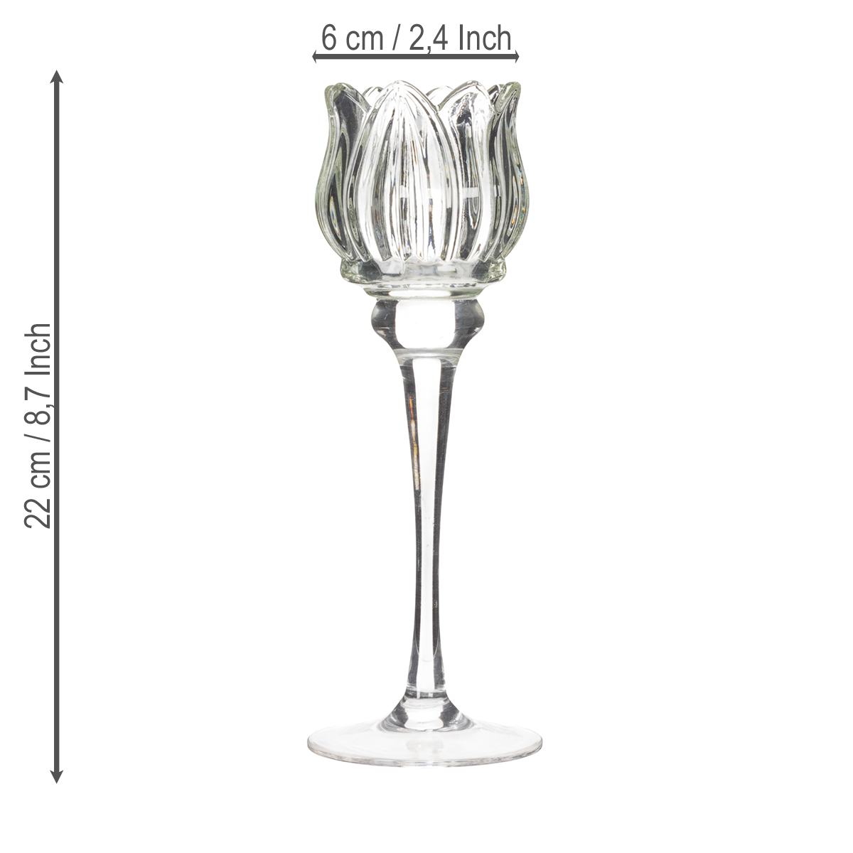 Číre sklo dodáva svietniku štýlovú ľahkosť, ktorá je zároveň robustná a odolná. Jemný tvar kvetu vytvára harmonickú hru svetla. Obzvlášť pôsobivo vyzerá v kombinácii s inými svietnikmi rôznych výšok alebo dekoratívnymi prvkami, ako sú okvetné lístky kvetov a jemné látky. S výškou 22 cm a priemerom 6 cm je ideálny na vystavenie na slávnostne prestretých stoloch alebo príborníkoch. A vďaka hladkému sklenenému povrchu je čistenie hračkou.