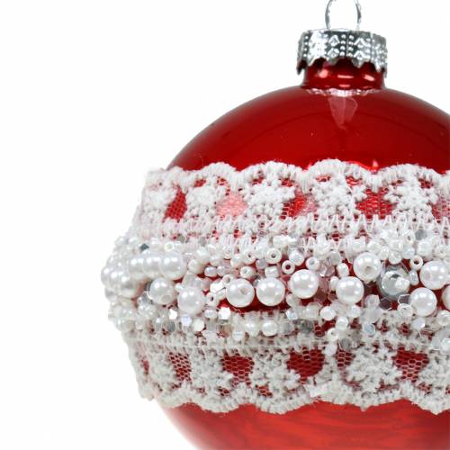 Sklenená guľa červená s čipkou a perličkami 3ks