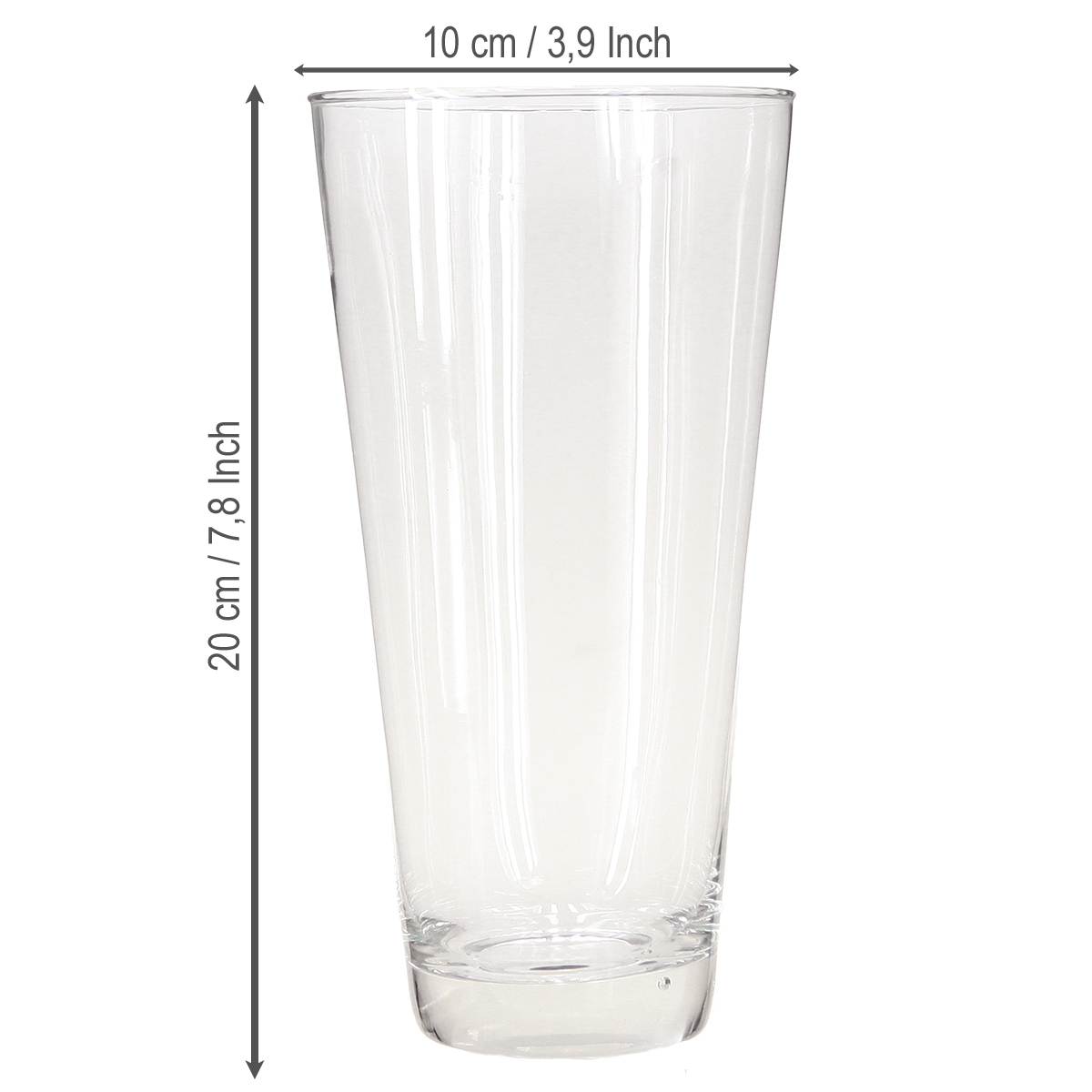 Priehľadná kónická váza je vysoká približne 20 centimetrov. Priemer na hornom okraji je približne 10 centimetrov, zatiaľ čo základňa má priemer približne 6 centimetrov.