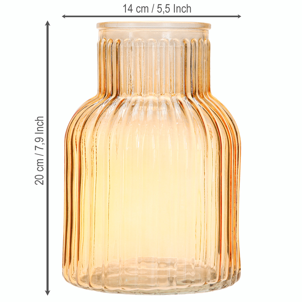 Sklenená váza na kvety s charakteristickými drážkami a teplým oranžovým odtieňom je skutočným lákadlom pre váš interiér. S priemerom približne 13,5 cm a výškou približne 20 cm ponúka perfektnú prezentačnú plochu pre čerstvé rezané kvety aj sušené kvety. Retro dizajn pripomína časy minulé a dodáva každej izbe istý nádych nostalgie. Táto sklenená váza je ideálna pre vintage a retro štýly zdobenia, ale dá sa použiť aj ako štýlový kontrast v moderných interiéroch. Skombinujte túto vázu s ďalšími dekoratívnymi prvkami v teplých jesenných farbách pre harmonický a príjemný celkový obraz. Dodajte svojej obývačke alebo kancelárii atmosféru a šarm s touto všestrannou dekoratívnou vázou od Floristik24.