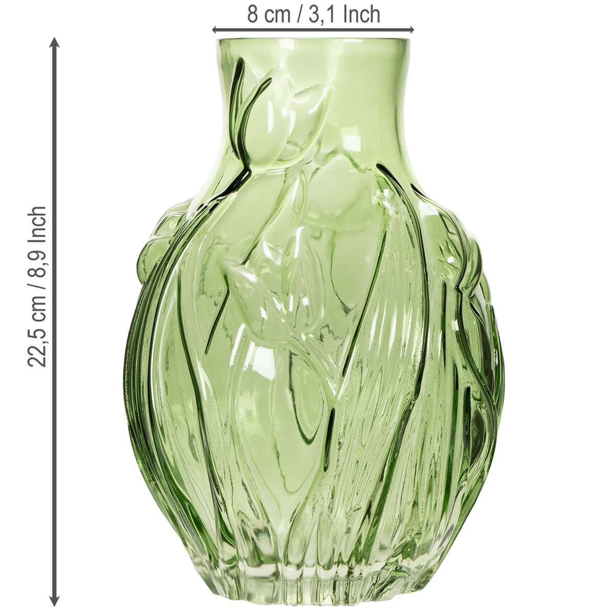 Sklenená váza s reliéfnym vzorom tulipánov na dekoráciu interiéru, 22,5 cm
