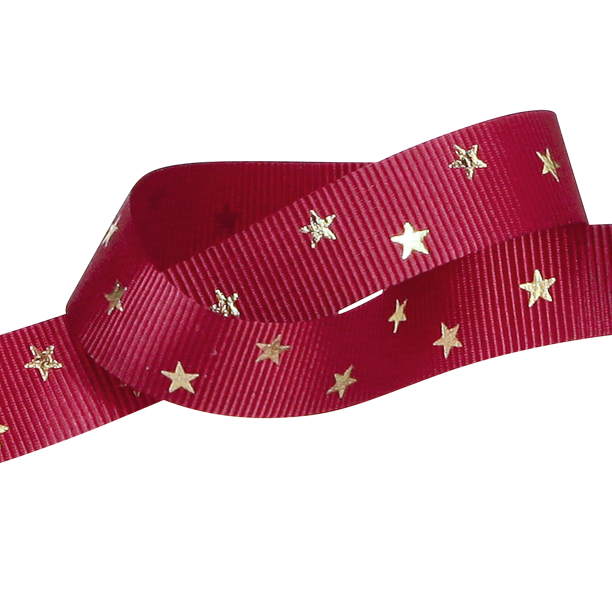 Slávnostná ozdobná stuha tmavočervenej farby so zlatými hviezdičkami, šírka 15mm, dĺžka 20m