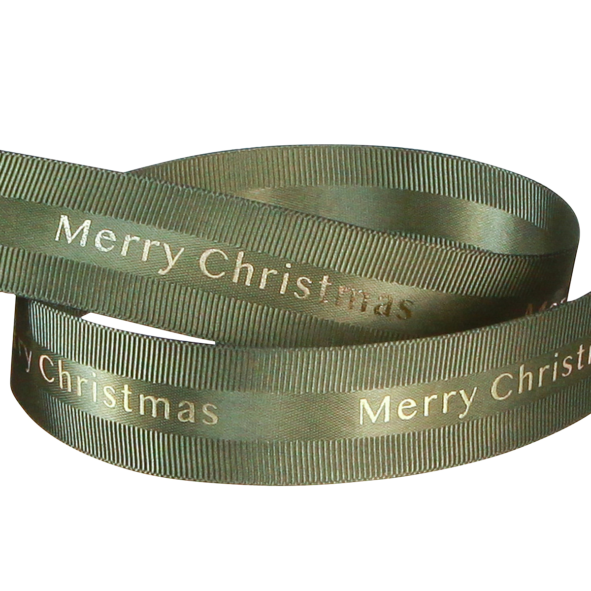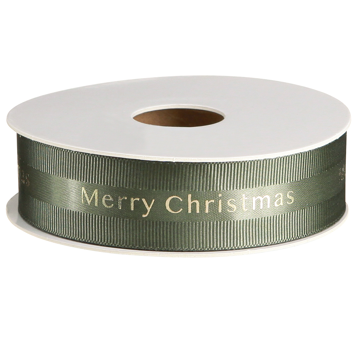 Slávnostná vianočná stuha tmavozelenej farby so zlatým nápisom 'Merry Christmas', šírka 25mm, dĺžka 20m