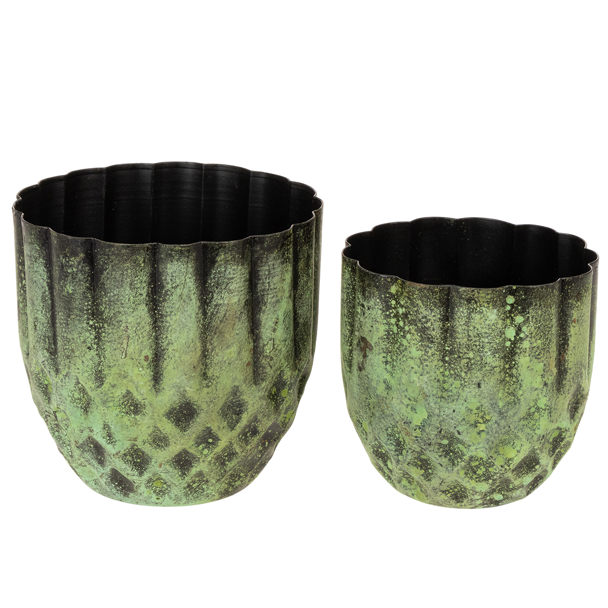 Táto sada sa skladá z dvoch okrúhlych kovových nádob rôznych veľkostí, ktoré sa skvele hodia k interiérovým štýlom s vintage charakterom. Zelenkastá patina vyzerá miestami ako zoxidovaný kov, ale je výsledkom šikovného nanášania farby.