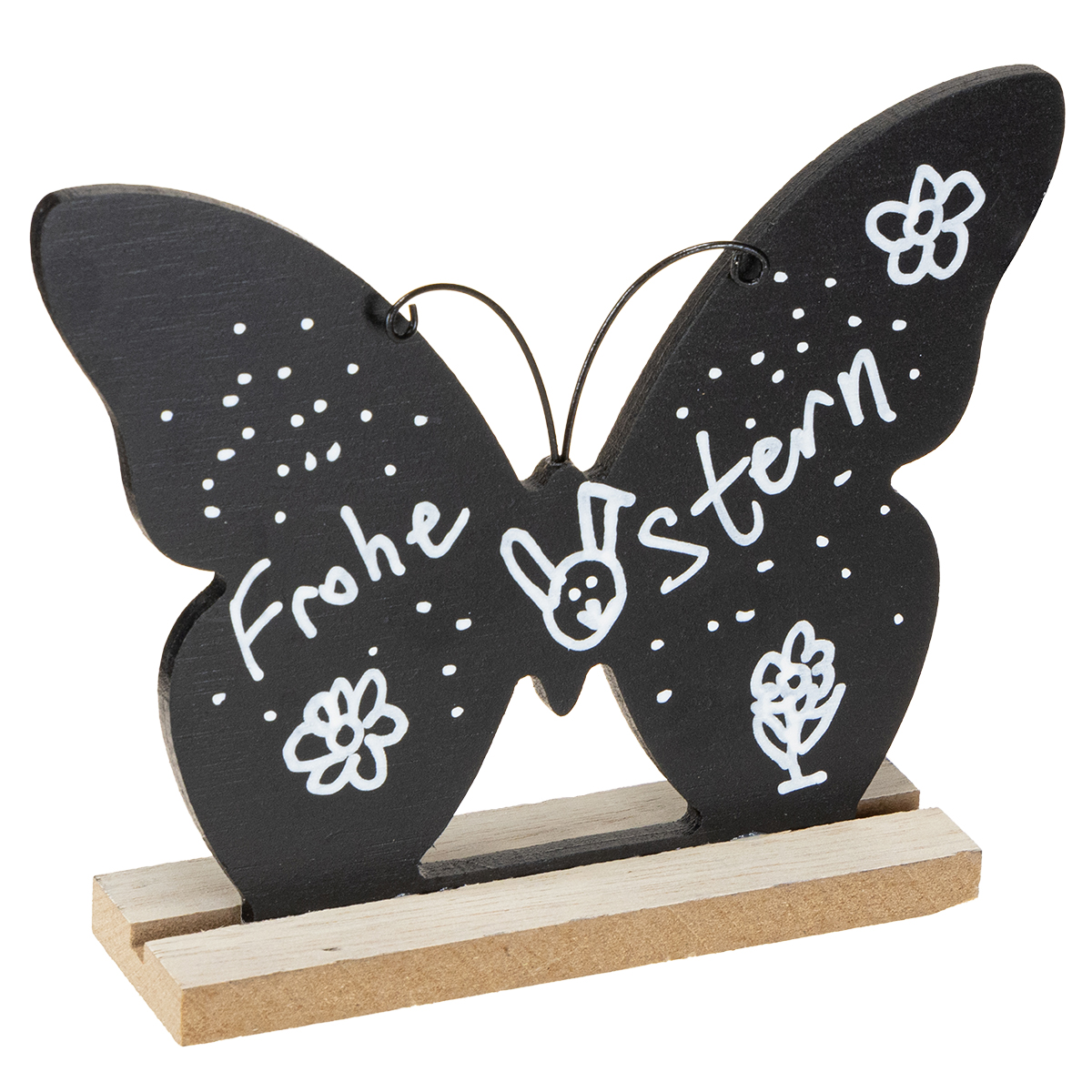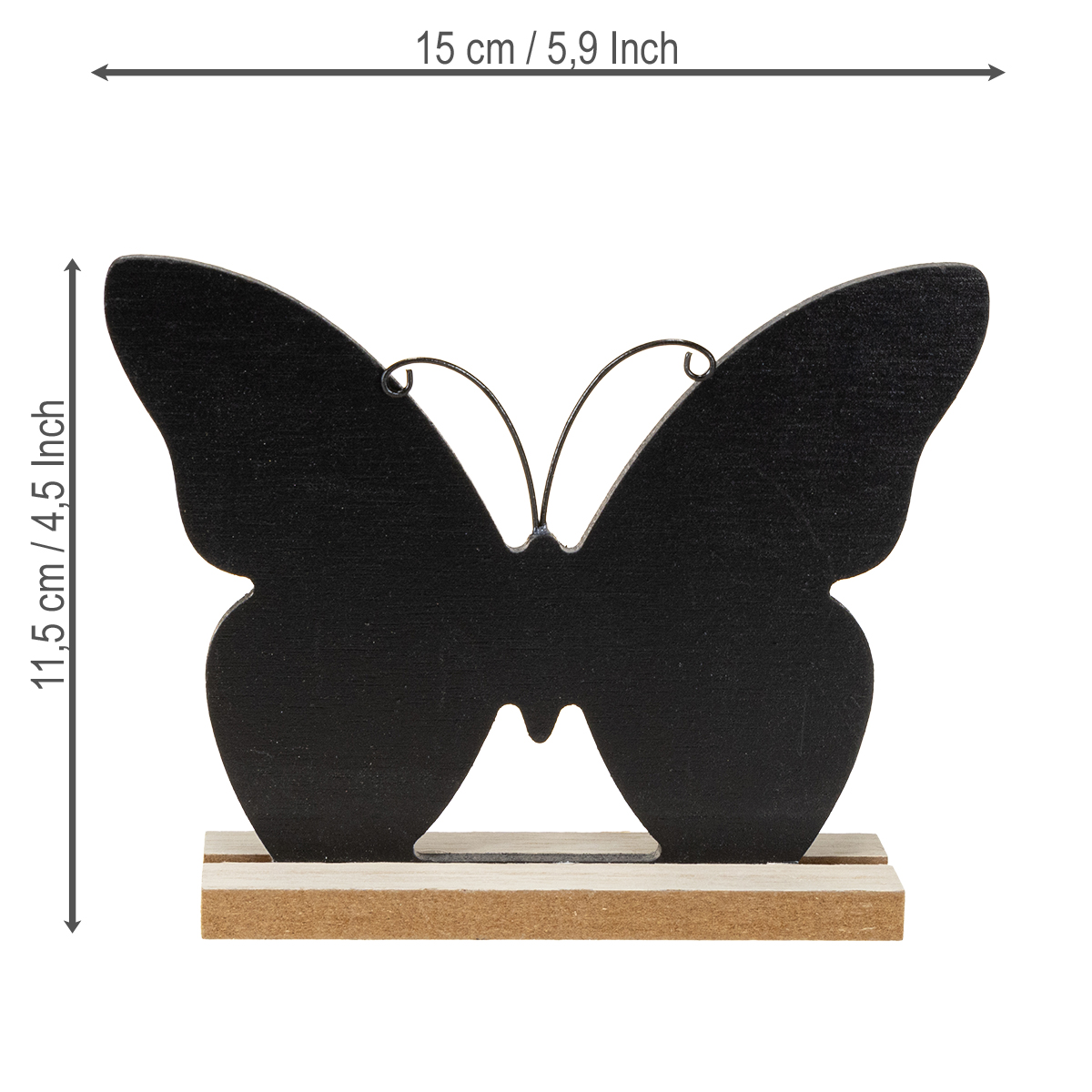 Čierneho motýľa dopĺňajú jeho jemné tykadlá vyrobené z rovnako čierneho kovu. Motýľ stojí v úzkom záreze uprostred drevenej základne, kde je bezpečne upevnený.