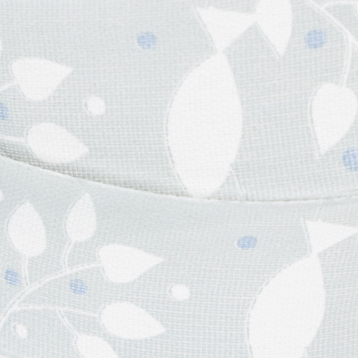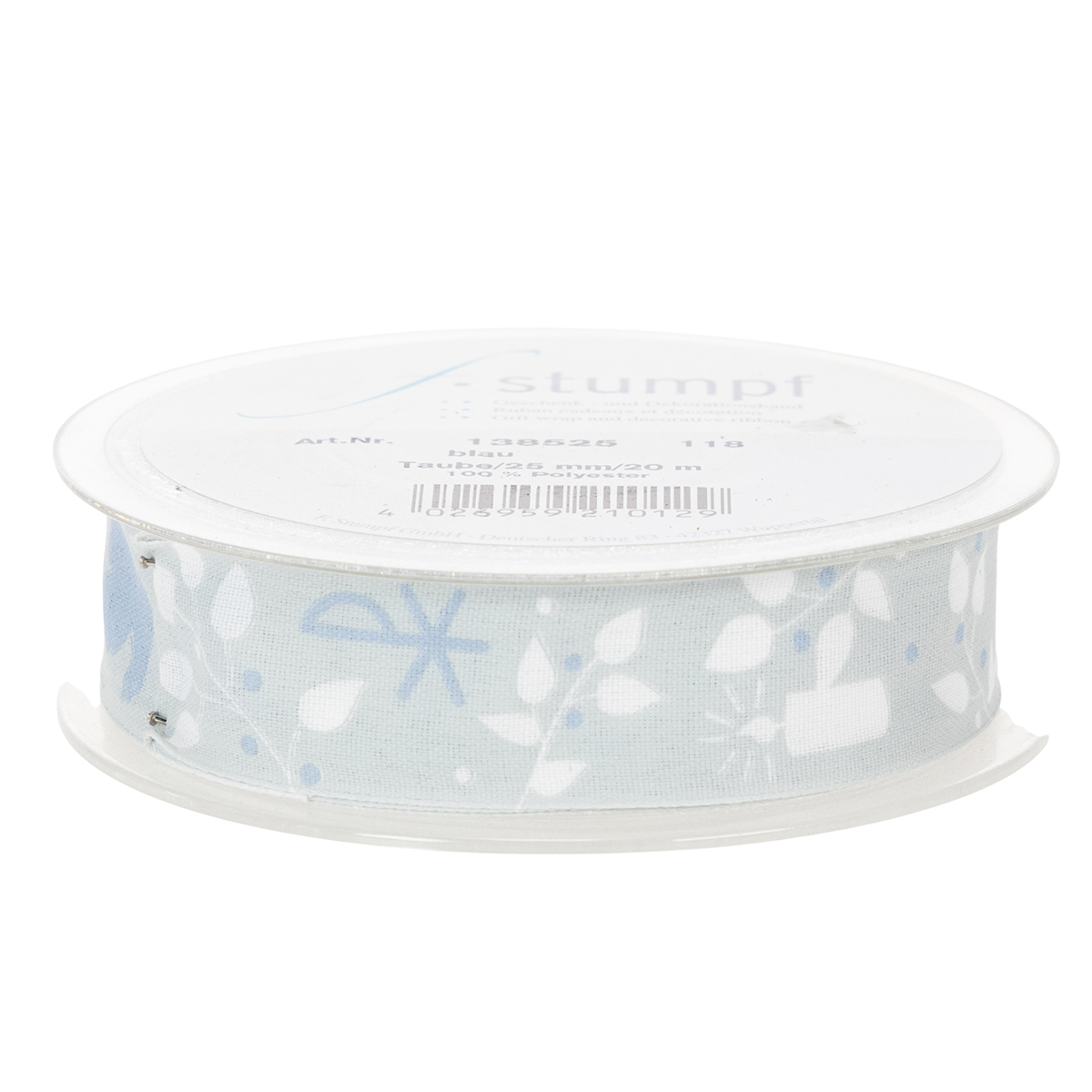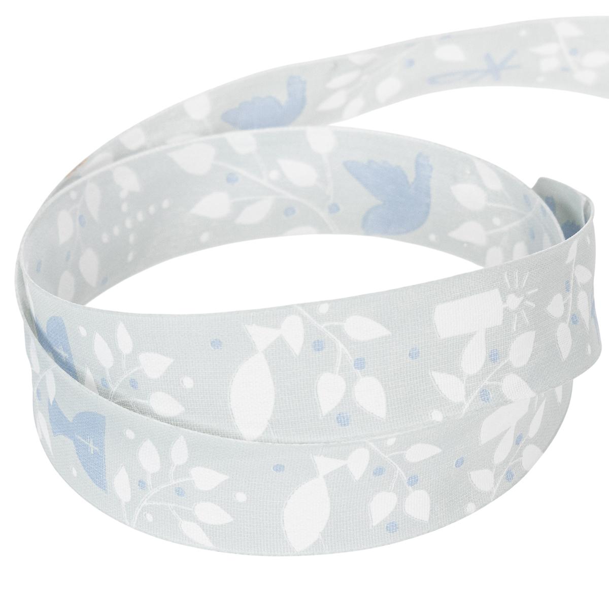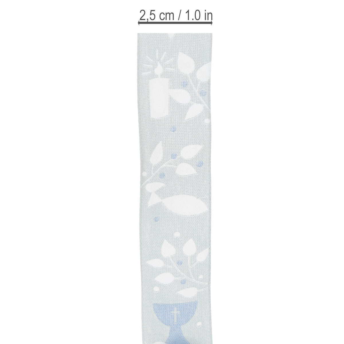 Svetlomodrý látkový pásik je vytlačený kresťanskými symbolmi v bielej a tmavomodrej farbe, ktoré odkazujú na náboženskú príležitosť a majú úžasne nadčasový dizajn. Keďže motívy sú obklopené úponkami listov, stuhu možno ľahko zakomponovať do kvetinových dekorácií na sväté prijímanie. Okraj dodáva ozdobnej stuhe stabilitu.