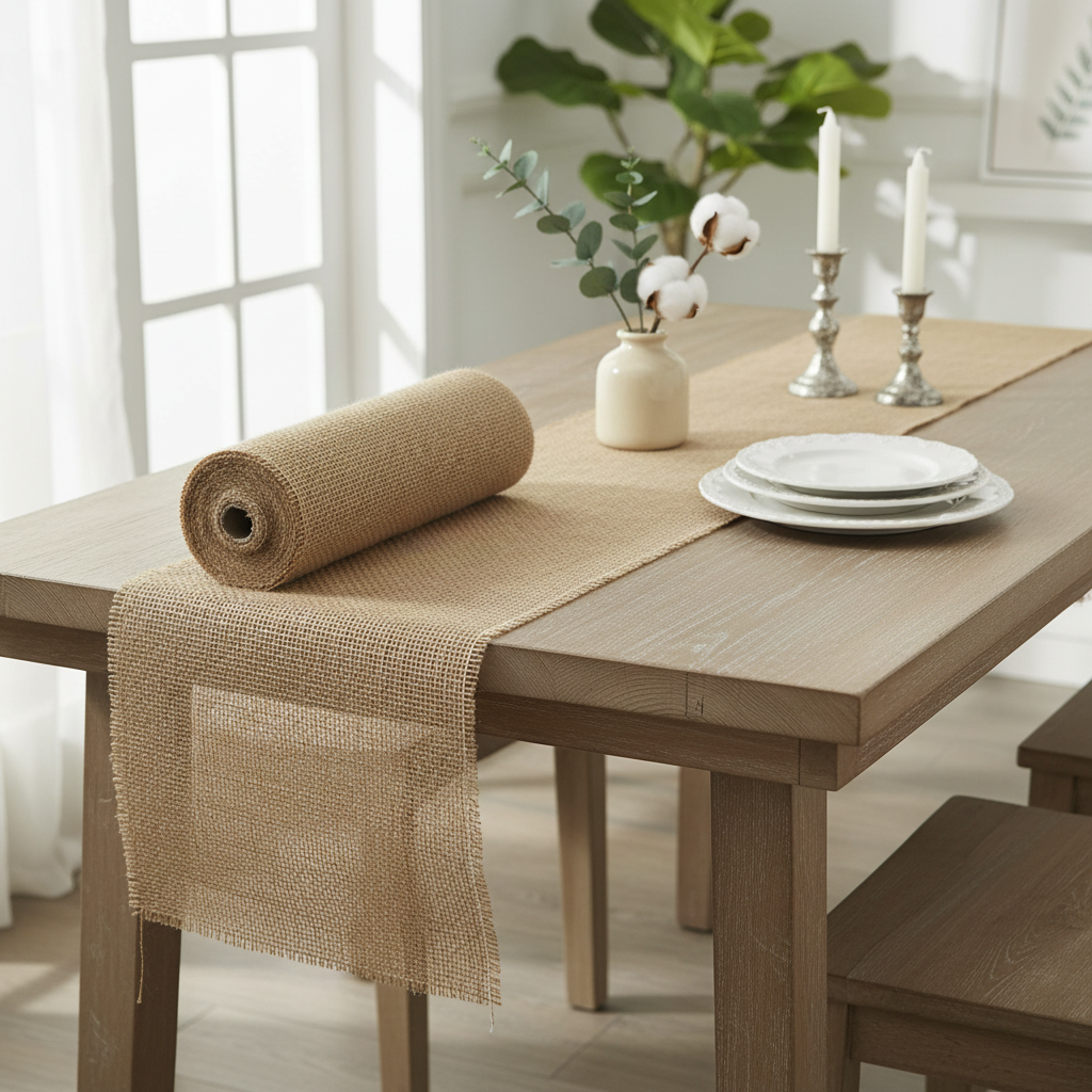 Pozor fanúšikovia štýlu vidieckeho domu! Táto prírodná jutová stuha sa dá úžasne použiť na všetky vidiecke dekorácie a dokonca aj na svadobnú hostinu! Jutové vlákno je neupravené a zostavené do vzoru s hrubými okami. Do okraja bola vpletená bavlnená niť, aby sa vlákna nerozmotávali. Napríklad v čase Vianoc položte stuhu cez stôl a potom položte červenú stuhu, niekoľko vlašských orechov, šišky a svietnik so stĺpovou sviečkou na vrch. Získate tak rustikálny, elegantný nádych, ktorý skvele ladí s dreveným nábytkom.