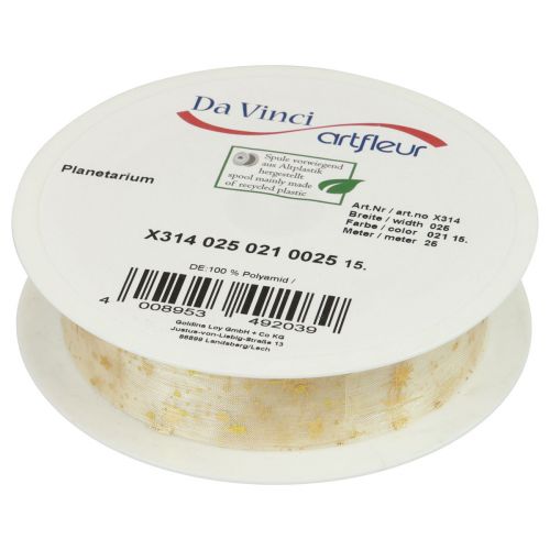 Ozdobná vianočná stuha z organzy v bielej farbe so zlatými hviezdičkami prichádza ako stuha so šírkou cca 25 milimetrov navinutá na plastovej cievke. Celková dĺžka organzovej stuhy je okolo 25 metrov.
