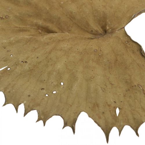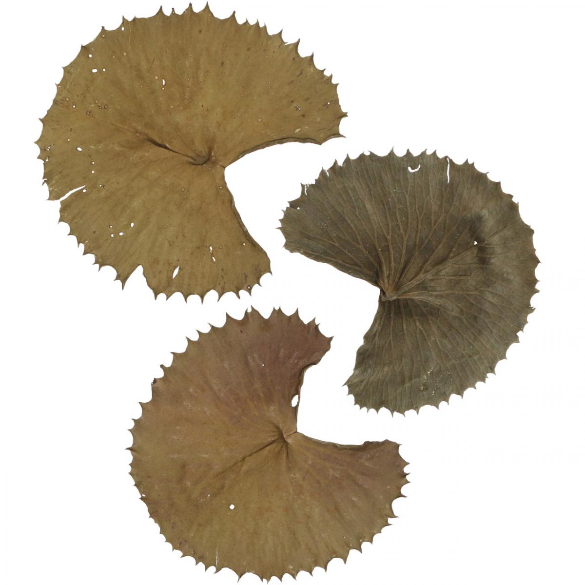 Lotosové listy, sušené a prírodné, dodajú vašej suchej dekorácii nádych Ďalekého východu. List lekna bol starostlivo zozbieraný, vysušený a konzervovaný na použitie v suchom kvetinárstve. Hnedastá spodná aj zelenkastá vrchná strana ozdobných listov jasne ukazujú prirodzené štruktúry listov. Okrúhly tvar so zubatými okrajmi robí z lotosu atraktívnu rastlinu pre aranžmány a prírodnú dekoráciu na stole. Deko listy nemajú stonku.Listy rámujú suchý aranžmán s exotickými rastlinami. Alebo lotosový list poslúži ako základ pre menšie sušiny ako sú cibuľky lotosu či sušené kvety, ktoré naaranžujete na malý ozdobný tanierik alebo podnos. Listy lekna sú preto ideálne aj ako základ pre potpourri. Ak dávate prednosť tvorbe nástennej maľby, môžete prírodné sušené lotosové listy poukladať do vejárového tvaru a opatrne ich prilepiť.